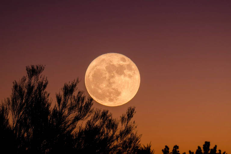 O auge da lua cheia ocorre às 17h30 (horário de Brasília), mas o melhor momento para observação será logo após o pôr do sol, quando o satélite natural surgirá no horizonte com um tom alaranjado marcante.