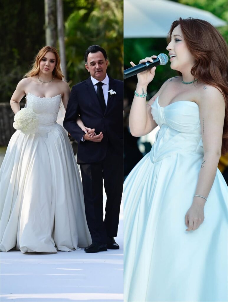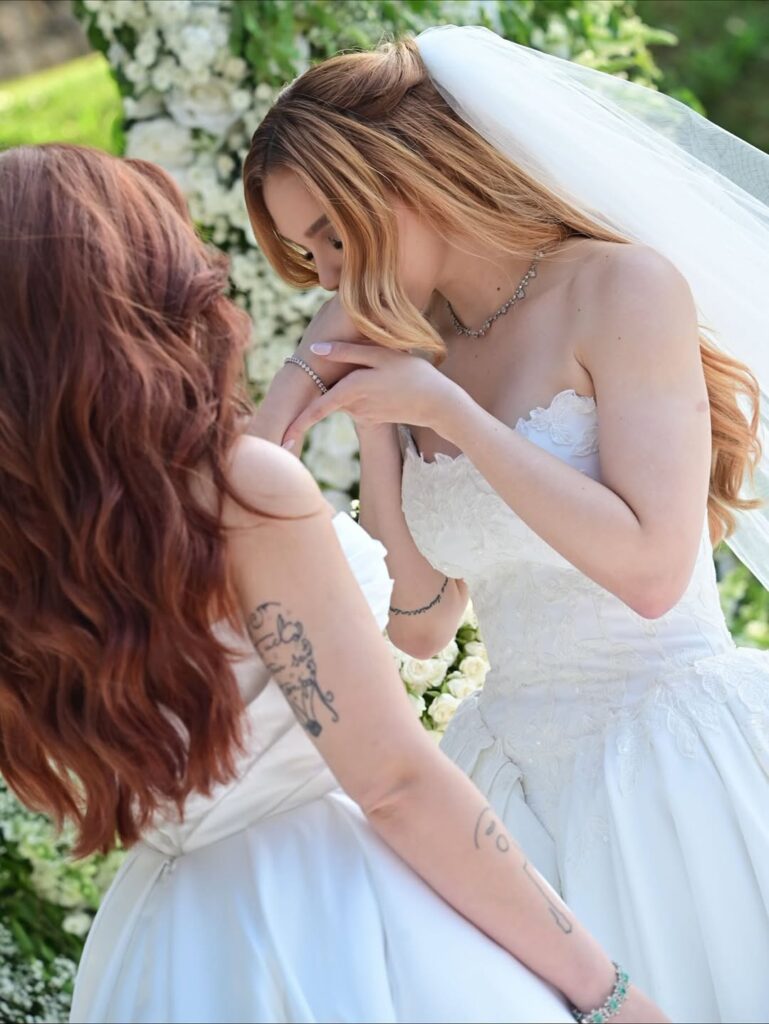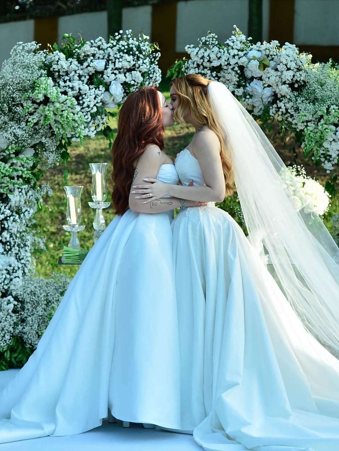 As noivas usaram vestidos brancos com corset marcado e saia longa e ampla. Um dos momentos mais marcantes da cerimônia foi quando Mari cantou ao vivo enquanto Júlia caminhava em sua direção no altar, emocionando os presentes. As duas estão juntas desde 2021.