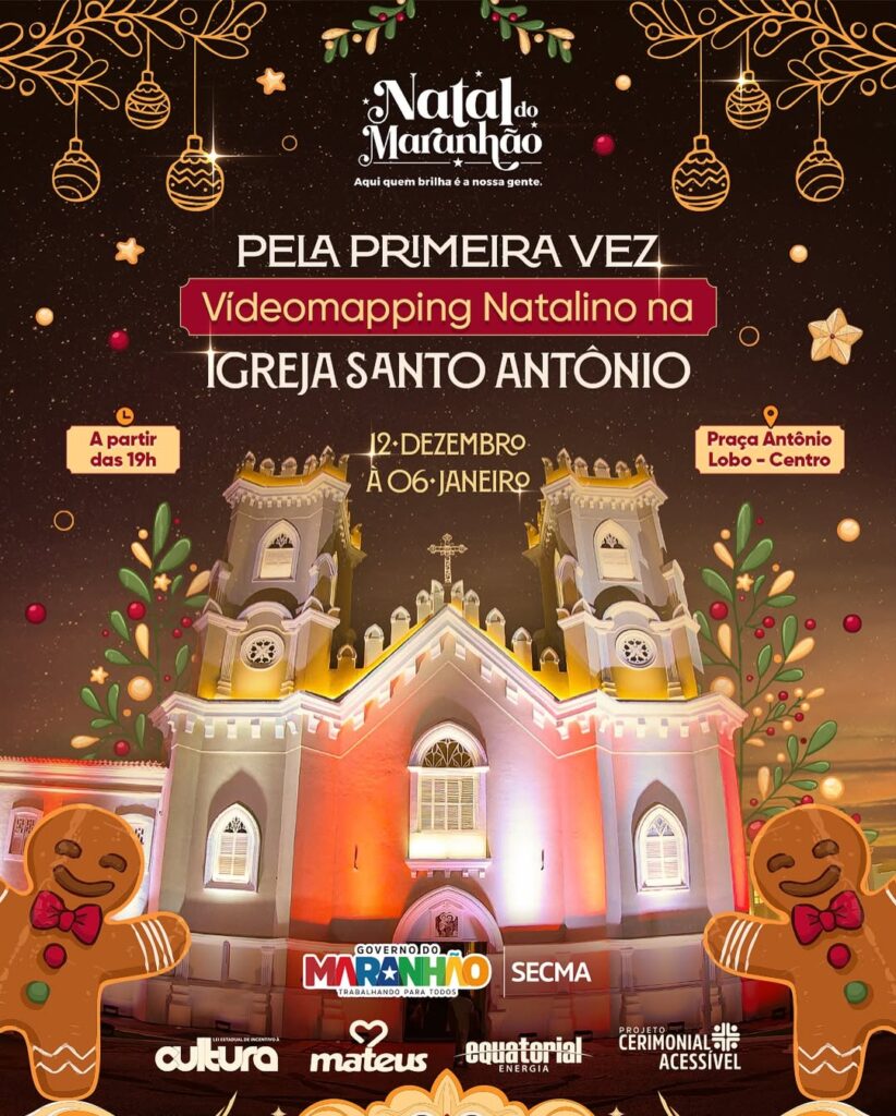 O tradicional show de videomapping está de volta, agora iluminando a fachada da Igreja Santo Antônio, em São Luís. A partir desta sexta-feira 12 de dezembro até o dia 6 de janeiro, sempre a partir das 19h, a Praça Antônio Lobo será palco de projeções que prometem encantar moradores e visitantes da nossa Grande Ilha. O evento convida o público a acompanhar de perto a magia e o brilho das apresentações noturnas. Serão 20 dias de exibições especiais, proporcionando uma experiência imersiva e emocionante ao público.